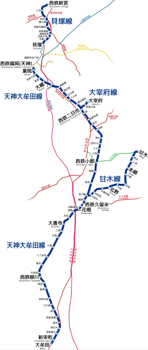西鐵全稱西日本鐵道,是日本一傢俬營鐵路公司,也是16間大手私鐵之一。業務包括營運福岡縣鐵路路線、九州7縣巴士路線、福岡機場(部分股權),以及房地產物業等。公司成立於1908年,前身為九州電氣軌道。