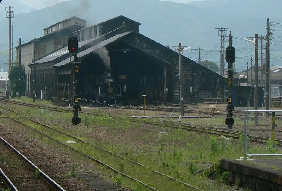 人吉站的磚造車庫以及從其中緩緩駛出的8620型58624號蒸汽機車