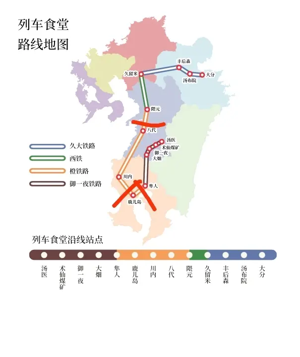 《列車食堂路線地圖》(畫紅線的是不存在的線路)。從湯醫開始到大分是本文章的順序,這篇文章可能會很長,尋找資料不易如果你喜歡可以點個贊支援一下,謝謝!一、線路