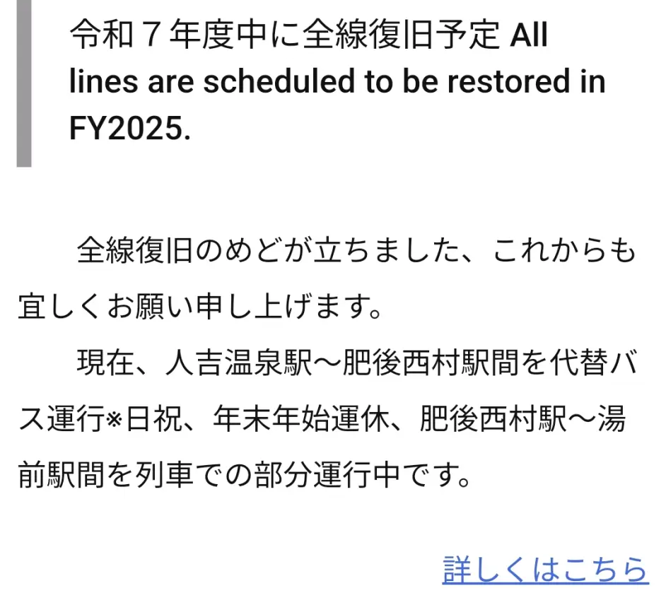 這篇公告的意思大概是在2025年恢復全線執行現在球磨川鐵道的人吉—湯前(御一夜—湯醫)的湯前線(湯醫線)是正在運營中,而人吉—肥後西村的這段線路還處於荒廢狀態,是由替代巴士執行的,這也很符合遊戲中御一夜鐵路的狀態。