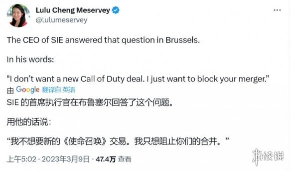 動視暴雪高管 Lulu Cheng Meservey 今日在推特上透露,索尼互動娛樂CEO 吉姆·瑞安(Jim Ryan)在2月21號,與歐盟一起舉行的非公開會議上直言:“我不想要新的《使命召喚》協議,我只想阻止你們(微軟)和動視暴雪合併”。