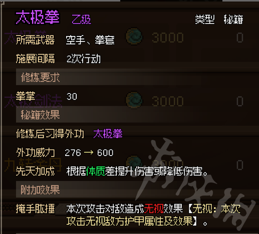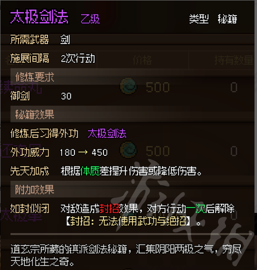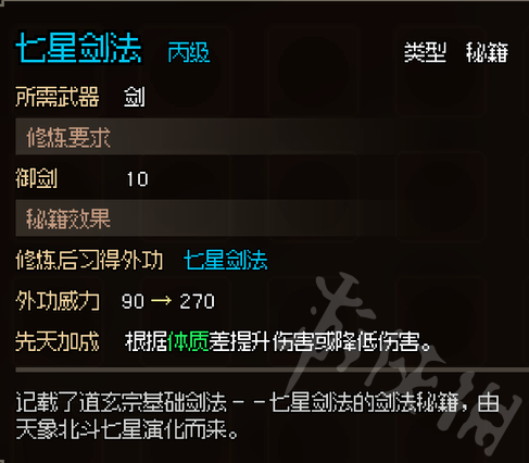 選加入道玄宗後,可獲得七星劍法或者五行拳其中之一,名聲+150,獲得道袍,白虹劍,絲拳套,紫裝太極玉佩。