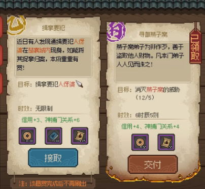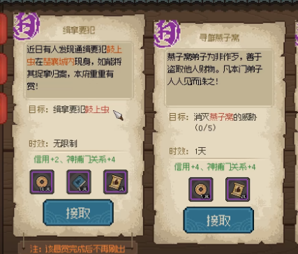 懸賞也有各種的等級,也就是完成的難度以及各種的要求,越高越難完成但是相應的獎勵會非常的豪華所以建議一定要去完成一下,這樣就可以得到高階的武功等等獎勵讓玩家的實力進一步提高,知識也有時間限制,特殊的懸賞無法重複領取所以需要慎重接受。