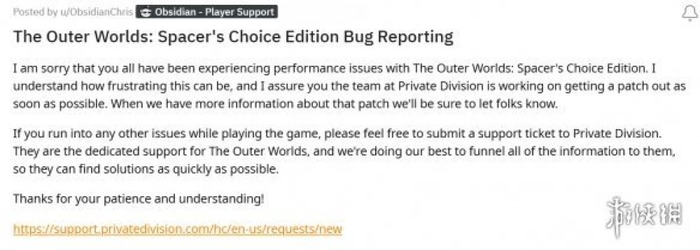 黑曜石的社群經理 Chris 在 Reddit 上向玩家道歉,他向玩家保證,發行商Private Division的團隊正在努力,會盡快推出優化補丁,若玩家在遊玩時遇到任何問題可以隨時向Private Division反饋。