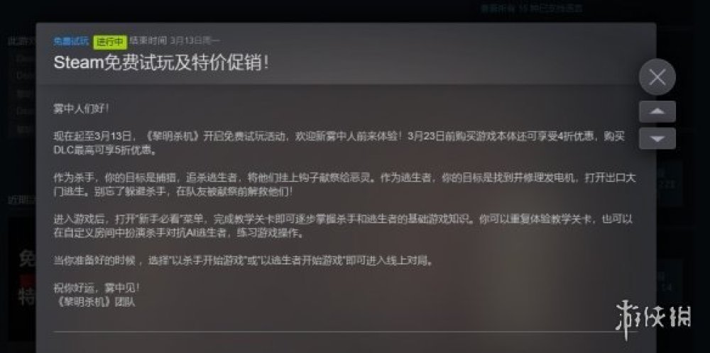 《黎明殺機》Steam開啟免費試玩,打折促銷同步進行中。即日起至3月13日,玩家可免費體驗《黎明殺機》,試用其中的5名殺手和7名逃生者角色。3月23日前,購買遊戲本體可享4折優惠、購買DLC可享最高5折優惠。 玩家在試玩期間的進度資料會被儲存,購買完整版遊戲後可繼承。