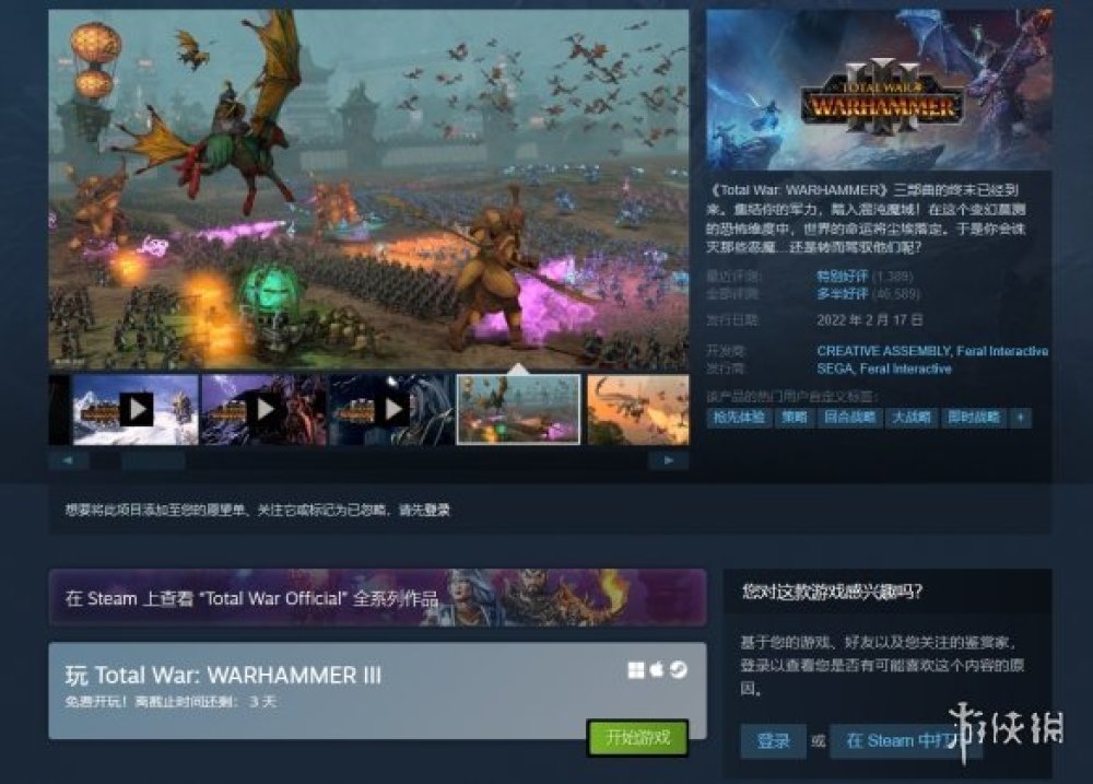 《全面戰爭:戰錘3》開發商CREATIVE ASSEMBLY宣佈,《全面戰爭:戰錘3》將Steam平臺開啟免費試玩活動,截止北京時間3月14號凌晨2點。此次免費試玩後的存檔可繼承至正式版,同時《全面戰爭:戰錘3》也正在打折促銷中,-33%,Steam國區售價199.66元,截止3月17號。