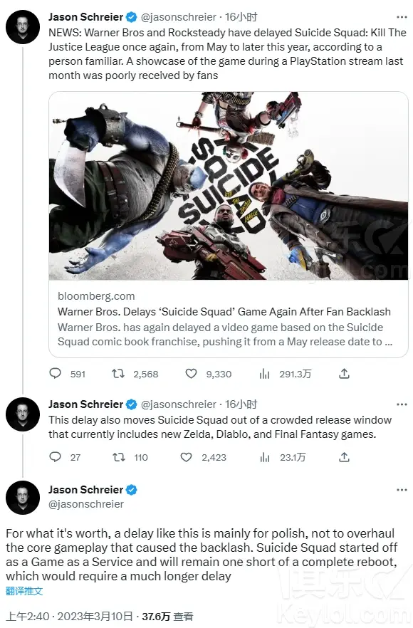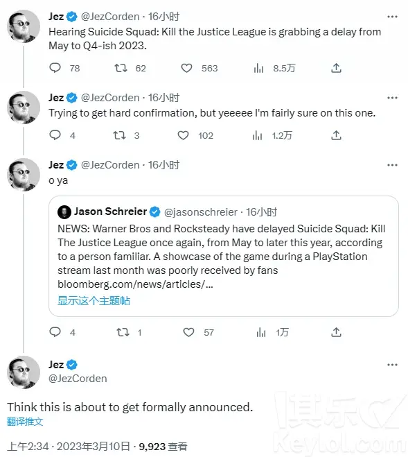 Windows Central執行主編Jez Corden也確認了這一訊息,並表示本作會延期至今年第四季度。他認為官方很快會就延期一事發布公告。《自殺小隊:戰勝正義聯盟》原定於2022年發售,後於2022年3月宣佈延期至2023年春季發售,並在最新一期State of Play上宣佈將於2023年5月26日發售。