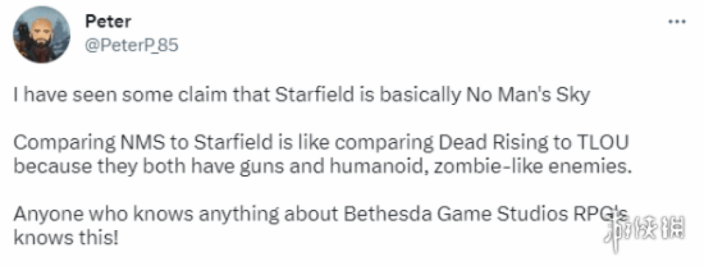 Peter覺得這事兒怎麼說吧,你要說《星空之地》像《無人深空》,就好像是你在拿《喪屍圍城》和《最後生還者》比,是的,這兩款遊戲都有槍械、人類和喪屍一樣的敵人。