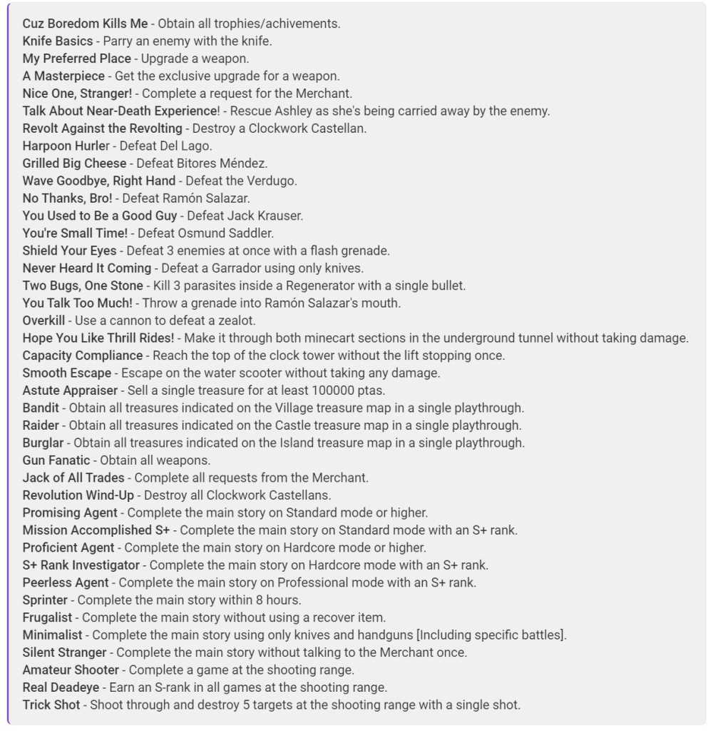 《生化危機4重製版》將於3月24日發售,目前有提前拿到遊戲的主播曝光了本作的獎盃列表。