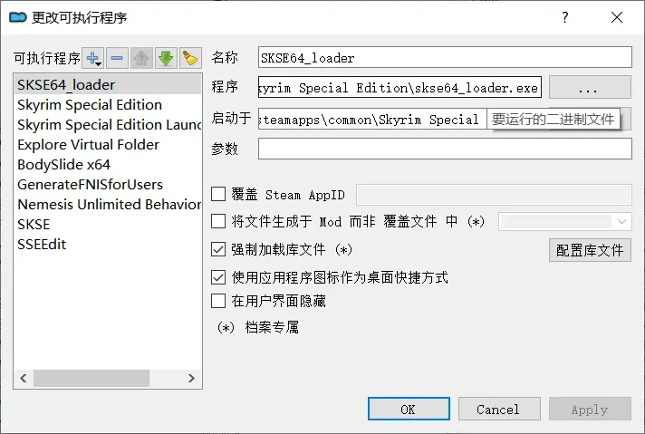 在程式一欄選中剛才在安裝目錄裡解壓出的skse64_loader.exe,即可使用SKSE64執行遊戲,並且以後都以SKSE64_loader作為遊戲啟動器