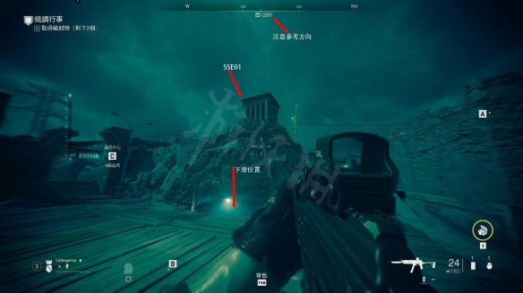 站在塔樓頂,看西南220方向,從這個石頭下面翻下去進入水中;