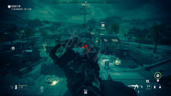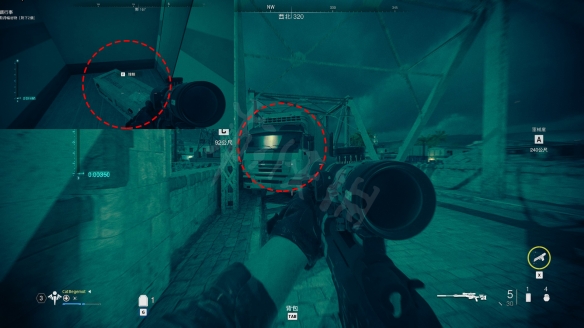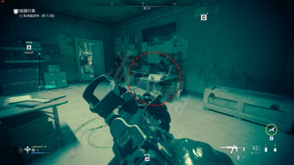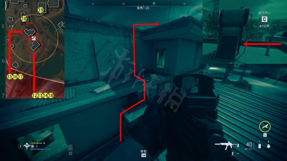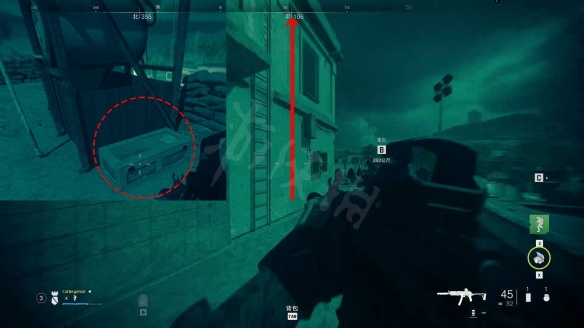 地圖所示一棟L形建築物,建築物前固定有兩個敵人的,順著爬梯上到屋頂後,去L形另一角,一個木箱子樣子。