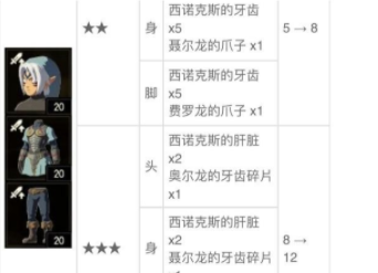 1.塞爾達鬼神套一級升級材料是西諾克斯的爪子5個、奧爾龍的鱗片1個,二級升級材料是西諾克斯的牙齒5個、奧爾龍的爪子1個。
