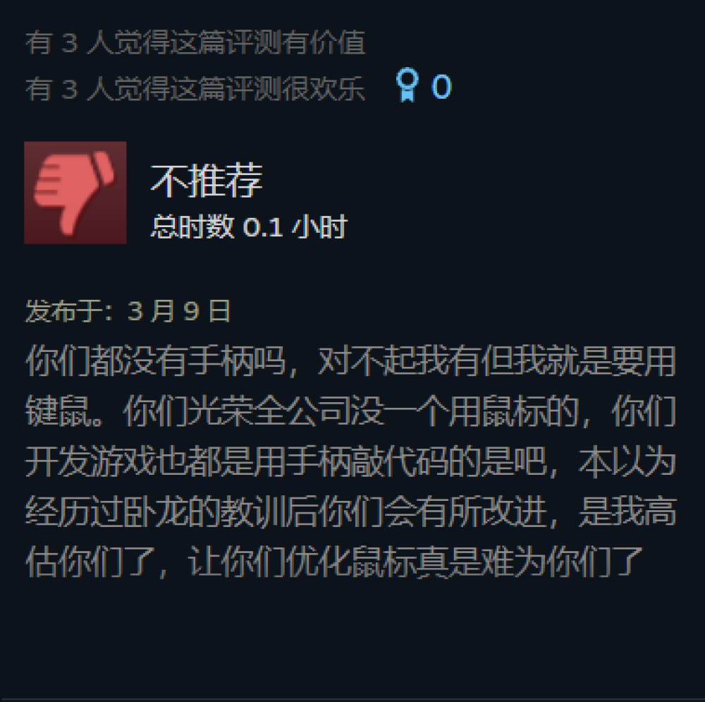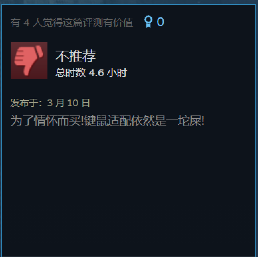 在steam為數不多的差評中,可以看見大部分差評都是關於鍵鼠體驗差的內容。