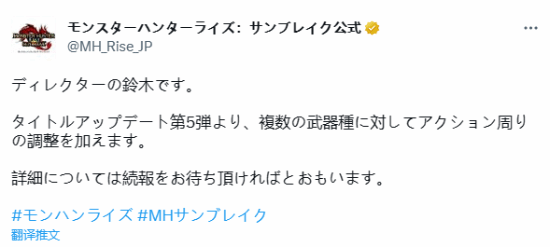 《怪物獵人崛起:曙光》官方釋出推文,總監鈴木佳剛表示,從“曙光”的第五彈更新開始,團隊將會對多種武器型別的動作進行調整。