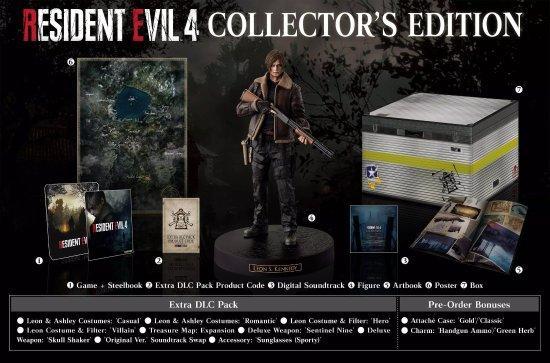 《生化危機4重製版》珍藏版包括遊戲本體、金屬收藏盒、一本遊戲藝術集、遊戲世界地圖、DLC 產品程式碼、原聲帶以及里昂雕像。