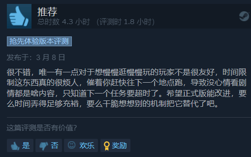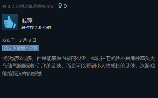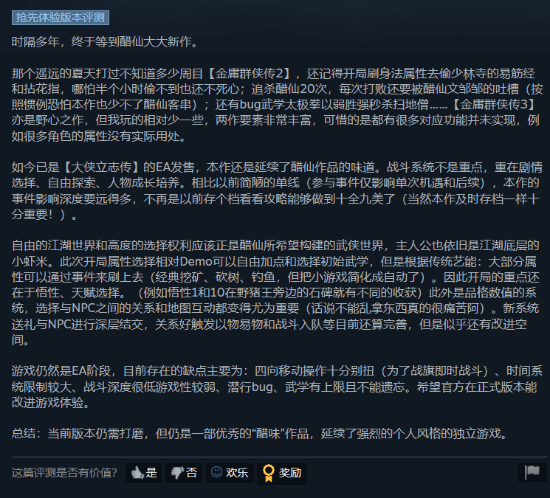 給出好評的玩家表示遊戲的自由度很大,能夠一口氣玩很久很過癮。玩家可以自己選擇在這個江湖成為什麼樣的人,能夠給人小人物成長的感覺。
