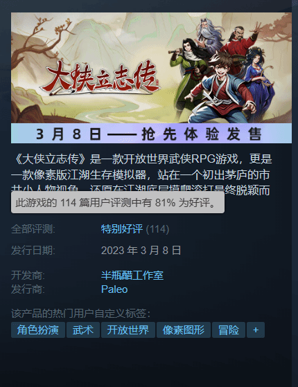 半瓶神仙醋的新作《大俠立志傳》現已在Steam平臺開啟搶先體驗,而目前Steam評價特別好評,114條評價中81%好評。