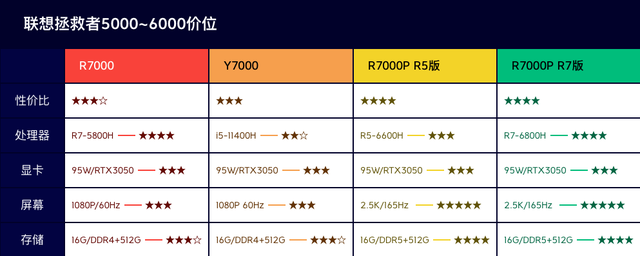 5000~6000價位是拯救者系列的最基礎入門款,分別有R7000、Y7000以及R7000P的R5版和R7版,這幾款在機身做工,散熱和介面配置,續航能力方面都基本一致,主要就是處理器效能以及螢幕素質配置不同,如圖所示: