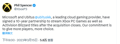 菲爾·斯賓塞今日釋出推文,宣佈微軟和領先的雲遊戲服務商Ubitus簽署了一項為期十年的合作協議。