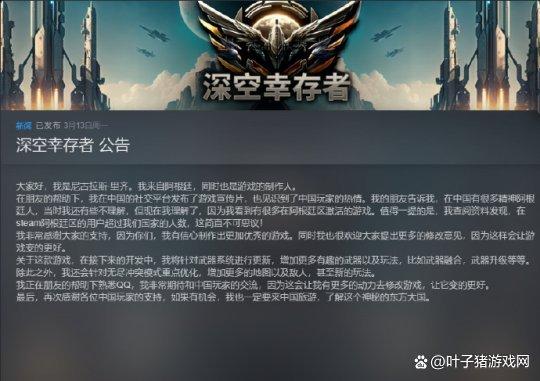 但相較於以往的國外獨立遊戲,《深空倖存者》在跟國內玩家的溝通方面會更加緊密一些。日前遊戲的製作人尼古拉斯-裡齊,就專門釋出了簡體中文的公告,感謝中國玩家們的幫助與支援。