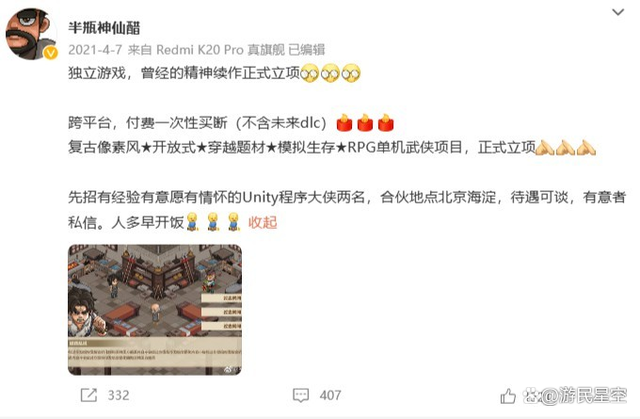2018年2月,醋仙沉寂許久的微博忽然更新,他表明自己正在備戰新的武俠專案,重新拾起了十幾年前開發獨立遊戲的老本行。而醋仙的突然露臉,也讓等待許久的老玩家看到了新作的希望。