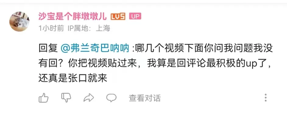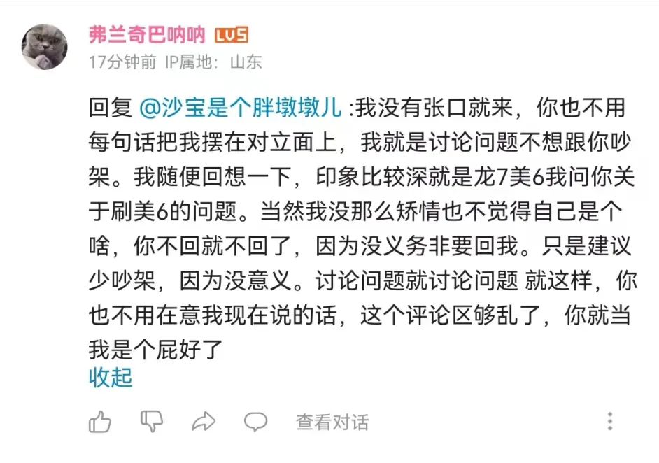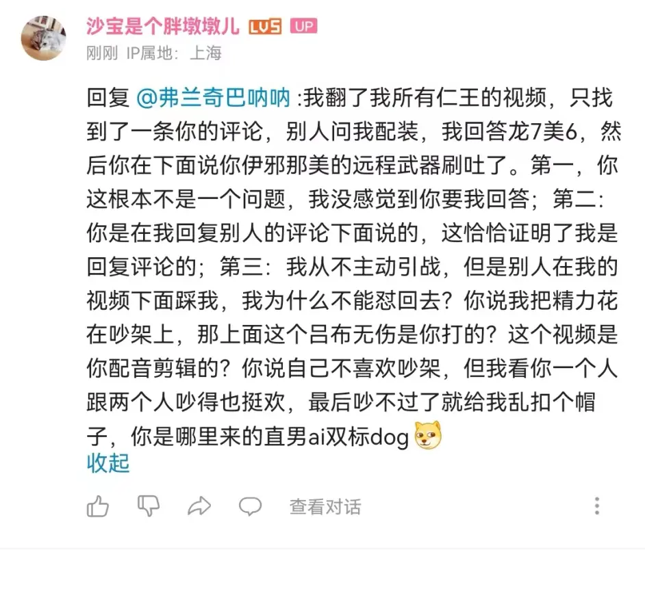 最近可能不小心蹭了點臥龍的熱度,發的兩個視訊裡都有不少爭論,我承認,我自己是個槓精,你敢嘴我兩句我一定回你兩句不會客氣,不管是網路上還是現實中我都是這樣。但有兩點,我從不主動引戰,最後如果發現是我槓錯了,我也會真心實意的認錯。但反觀這位水友的態度,他最後說的是:你作為一個遊戲UP,怎麼能跟我這麼吵呢。