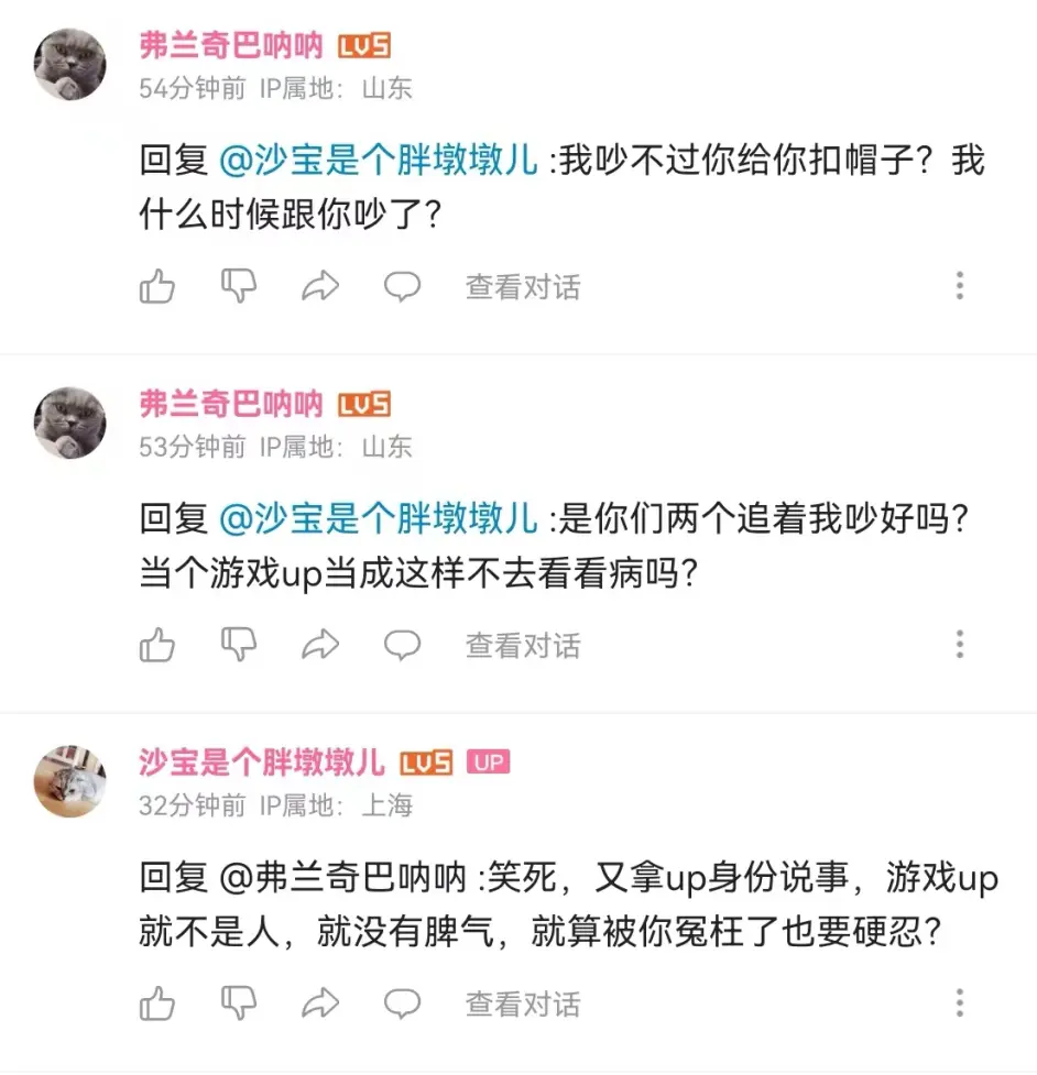 就這件事情,這位水友跟我爭執了起來。這本來都是大家對遊戲的不同理解,在互相說服不了情況下,這位水友開始給我扣起了帽子,說我是個不稱職的UP,他以前發評論問了好多問題,我都沒有回覆,只顧著跟別人吵架,所以他就取關我了。