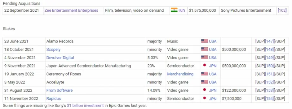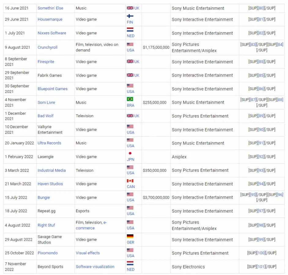 到2023年,索尼還剩下50億美元進行投資,以下是2021年計劃公佈以來的投資名單。