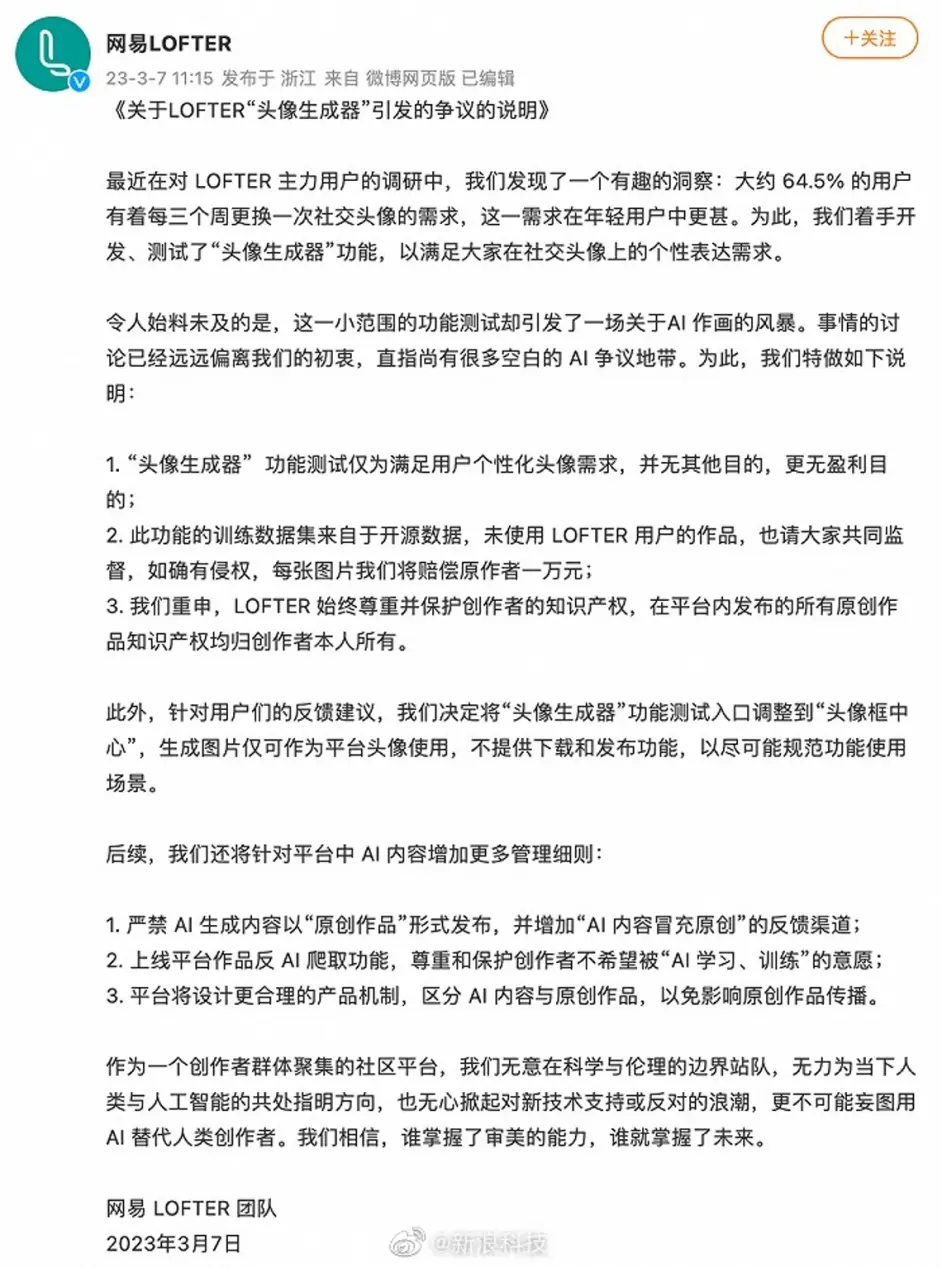 針對“頭像生成器”引發的爭議,網易LOFTER發文迴應稱,“頭像生成器” 功能測試僅為滿足使用者個性化頭像需求,並無其他目的,更無盈利目的。此功能的訓練資料集來自於開源資料,未使用LOFTER使用者的作品,如確有侵權,每張圖片將賠償原作者一萬元。