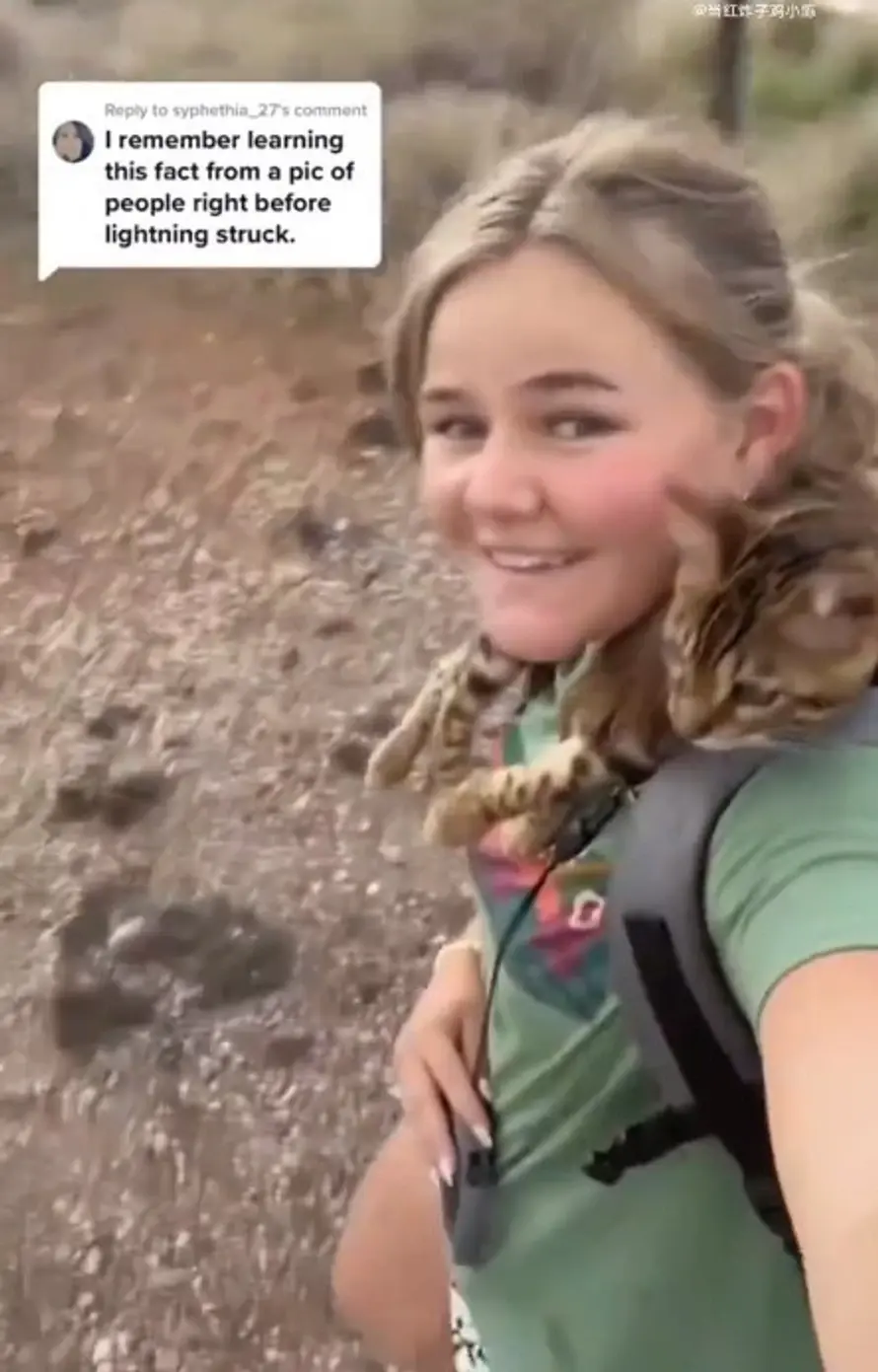 國外一小姐姐帶貓野營,走著走著發現自己毛髮全部倒立,身體還有刺痛感,一個不好抓著貓猛向自己車上衝去,直到坐進車裡才確認安全。