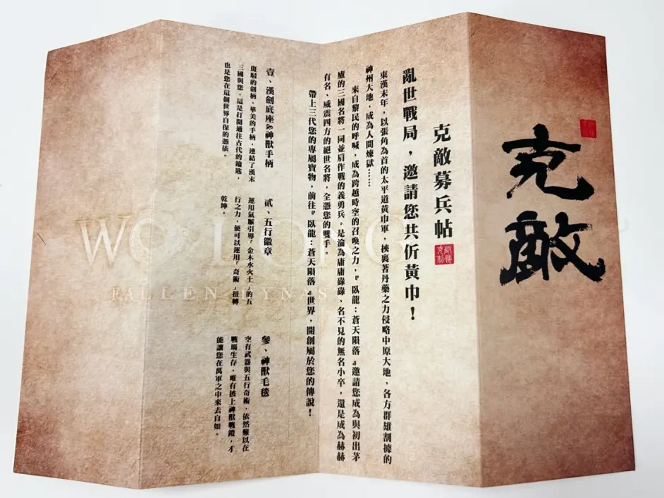 展開募兵帖,上面書寫著《臥龍》的遊戲介紹,以及禮盒內容物的清單,還配上了風味十足的說明文字。