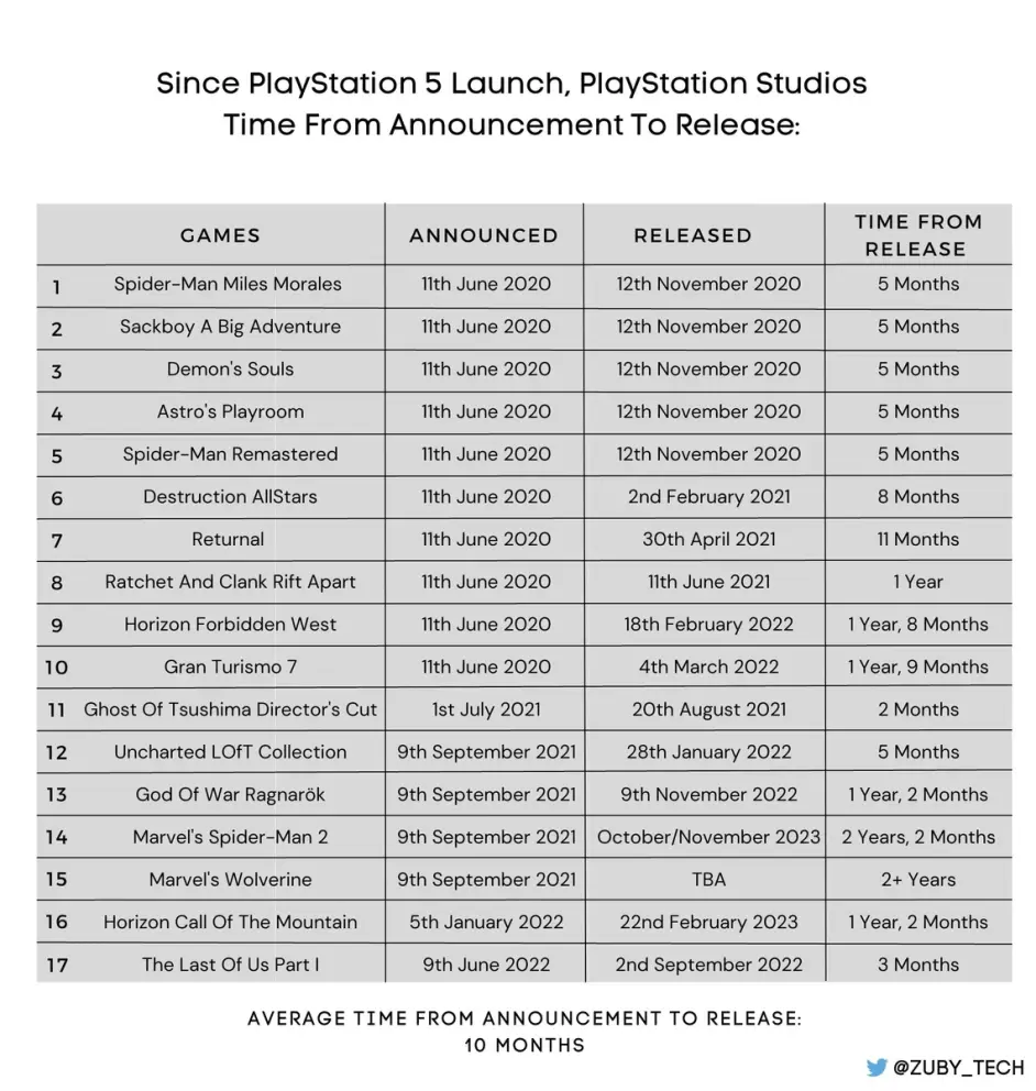 PS5第一方遊戲從公佈到發售時間:平均10個月近日,推特使用者Zuby_Tech總結了索尼PS5第一方遊戲從公佈到發售所間隔的時間:平均10個月。