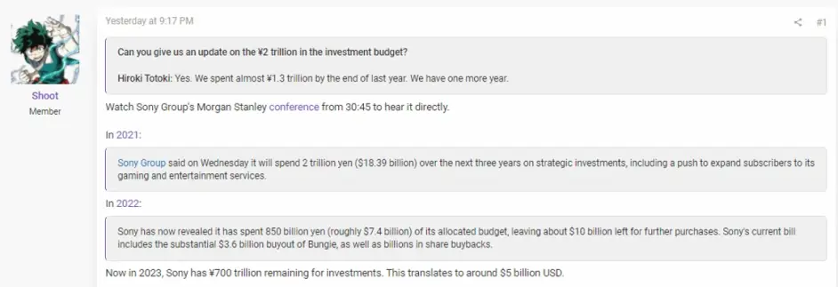 外網統計:索尼收購完棒雞後 還有50億美元投資預算近期,resetera論壇上有玩家分析了索尼的投資預算,結合官方宣告和第三方網站的統計,認為索尼目前還有50億美元用於投資。