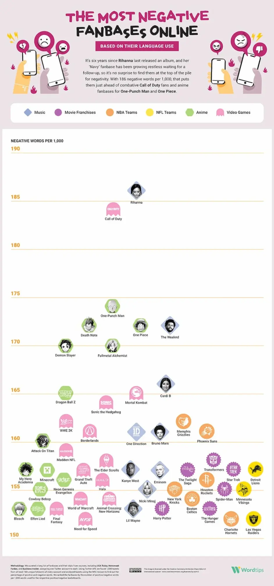 其他領域,蕾哈娜的粉絲是最負面的團體,One Direction是最積極的。前10名的負面群體中有6個是動漫迷,前10名的積極群體中有7個是音樂迷。