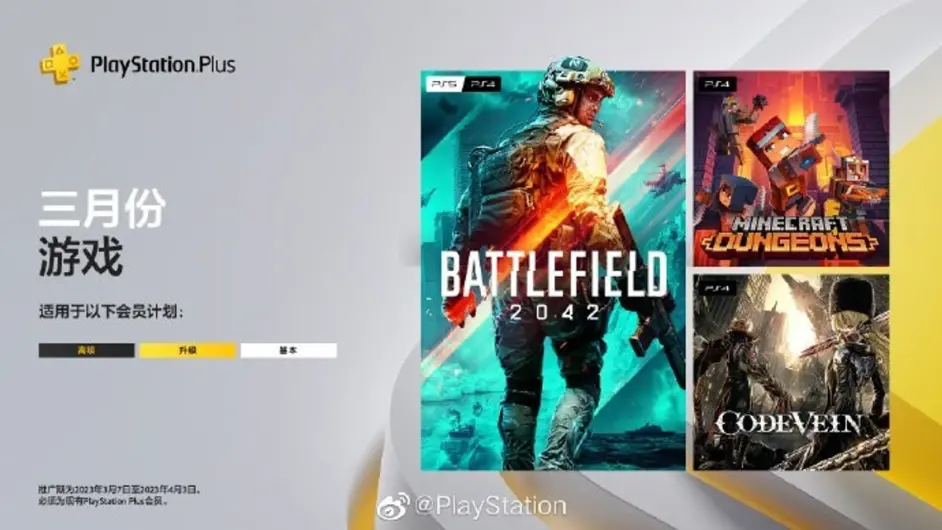 PS+3月會免正式上線:《戰地2042》《噬血程式碼》等港服PS Plus 3月會免遊戲現已正式上線,分別是:《戰地2042》(PS5|PS4)、《我的世界地下城》(PS4)和《噬血程式碼》(PS4),領取時間截至4月3日,各位記得領取。