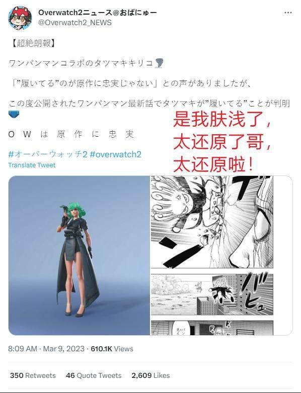 一位曾經吐槽《守望先鋒》和《一拳超人》聯動內容的網友,原先還表示這次聯動“不地道”,聯動龍捲的霧子不該穿著那麼明顯的安全褲。而在知道“龍捲穿了”訊息後,他立刻改口,稱讚起了本次聯動的“信達雅”。