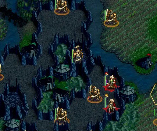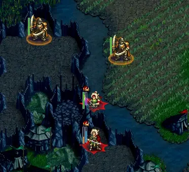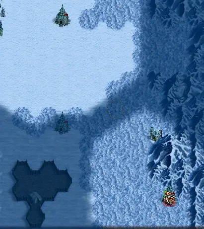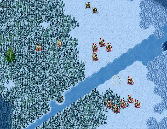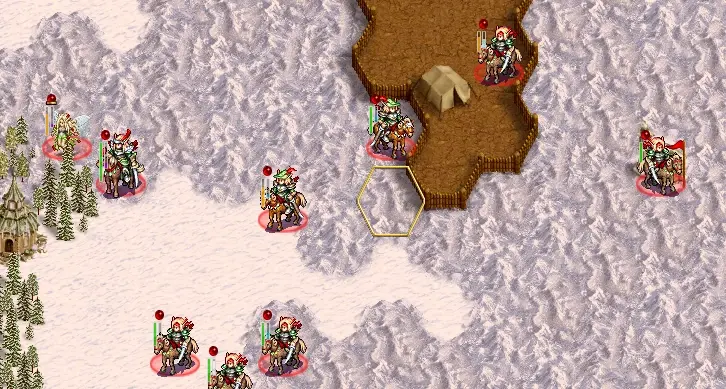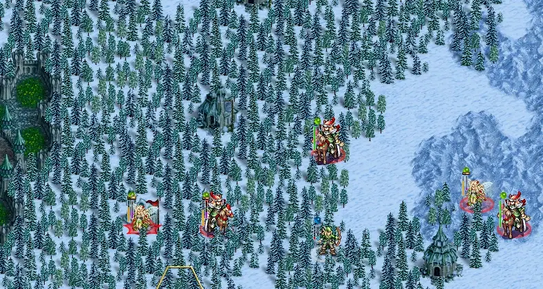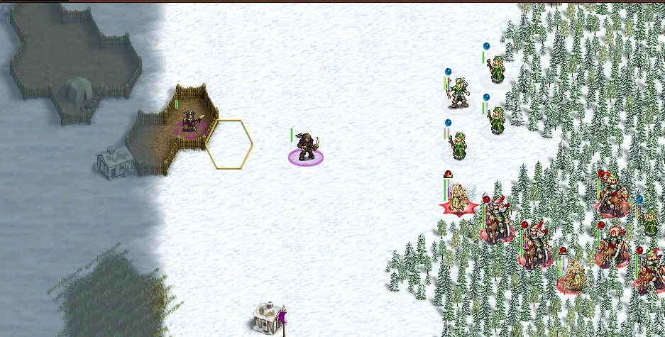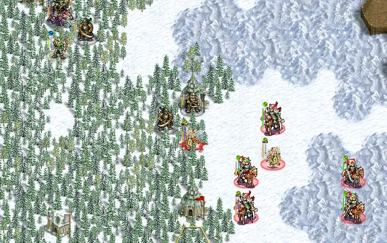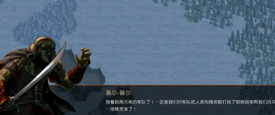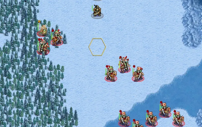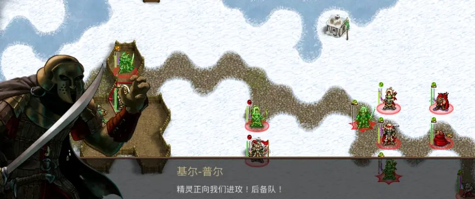 上方簡單多了,不要急著與敵方交戰,先行者隱藏在森林,冰面打滑,他們跑不快,等後方的偵察兵跟上,更重要的是,等盟友的精靈援軍到來