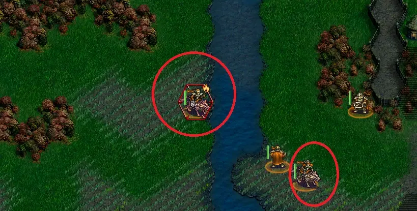下方第二個陷阱,只要進入獸人領袖的周邊任意一格,就會觸發後備隊事件,四個狼騎兵滿級衝鋒,這高階兵恐怕保不住
