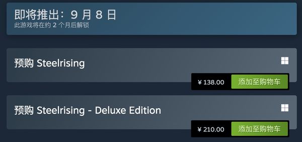 另外,《鋼之崛起》目前也在Steam商城開啟了預購,標准版售價138元,豪華版售價210元,根據頁面顯示,遊戲支持簡體中文。