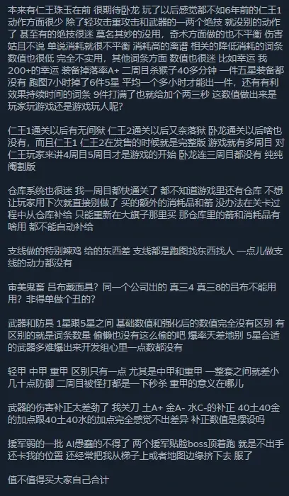 臥龍在PC還未正式發行時就受到了廣大玩家的關注,大家都對這款遊戲充滿了興趣。但是沒想到開發商卻完全沒有用心優化PC端操作。完全混亂的鍵鼠作業系統,極差的遊戲優化(閃屏,掉幀,閃退),還有不合邏輯的倉庫系統等等一系列的問題,導致了遊戲剛發售就直接被玩家爆到只有37%的好評率。