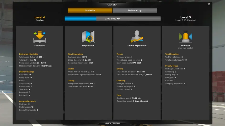 This new redesign will now feature a much more detailed look into your statistics and previous deliveries. The UI now shows 4 sections which are: Deliveries, Exploration, Driver experiences, and Penalties. Each of these sections displays different statistics that give you a more in-depth review of your journey as a truck driver so far including total deliveries, your past delivery ratings, how many of your deliveries were on time, map exploration, companies visited, truck data and discoveries.