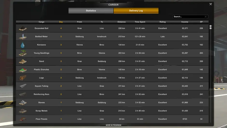我們還重新設計了運輸日誌,其清晰地顯示你們的過往任務、貨物、運輸日期、收入、XP、花費的時間等。我們清楚這些統計資料是駕駛員們用以回顧運輸的重要資訊,尤其當你們是 VTC(虛擬貨運公司)的一員時需要記錄你們駕駛活動的過往任務。