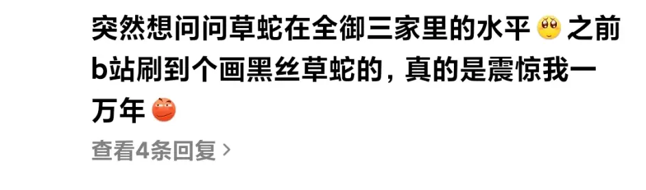 具體說下那張圖好在哪裡,首先是肉感,和我其他見到的藤藤相比,AzRE畫的蛇能看到明顯的蛇身體轉折處,並且肌肉條紋明顯,這點尤其是穿黑絲時非常明顯,讓人有一種油亮的感覺,然後把目光往上移一點的絲帶處,勒得很到位,可以從暗的地方看出來那種肉堵在介面處的效果,再往左移到會陰兩腿之間,只能說包得不錯,再往下走,蛇尾雖然上面什麼都沒有,但中線總是能讓我把剩下的地方腦補出來,還有尾巴上的絲襪末端,有點項圈的感覺,挺好,唯一讓我有點不明白的是右腰那裡看著有點怪,感覺像鬆了寬了什麼的