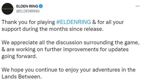 《艾爾登法環》官方還感謝了粉絲們的支持,《艾爾登法環》雖然已經發售了近四個月,但目前仍然在遊戲銷量排行榜上佔據一席之地。官方承諾他們將進一步改進未來的更新,希望粉絲們能繼續享受在這片土地上的冒險。