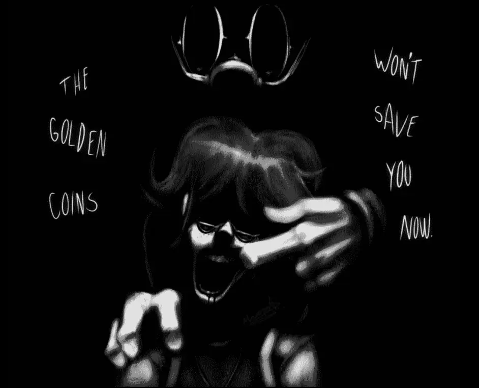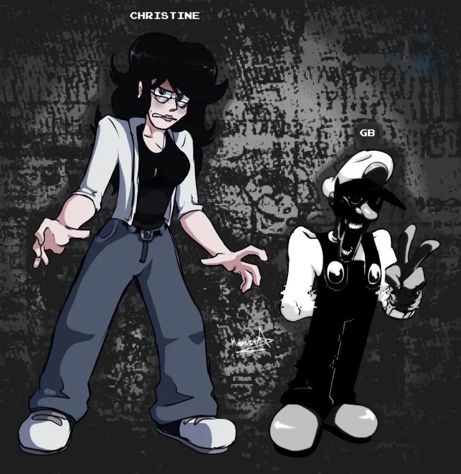 一個身影從後面轉過身來,戴著白色帽子,穿著黑色工裝褲,留著黑色頭髮,穿著閃亮的鞋子,“那是……馬里奧嗎…?”她問自己,當她走近這個生物時,她被自己看到的東西嚇了一跳,這個身影轉過身,是一個怪誕版的水管工,非常燦爛的笑容,似乎在融化的面孔,像月光一樣潔白的眼睛和笑容,嘴裡還滴著黑色的液體,它的手臂開始以一種奇怪的方式伸出,手套下伸出黑色的紋路,這個身影站在克莉絲汀面前,用一種與馬里奧有點相似的聲音說道: