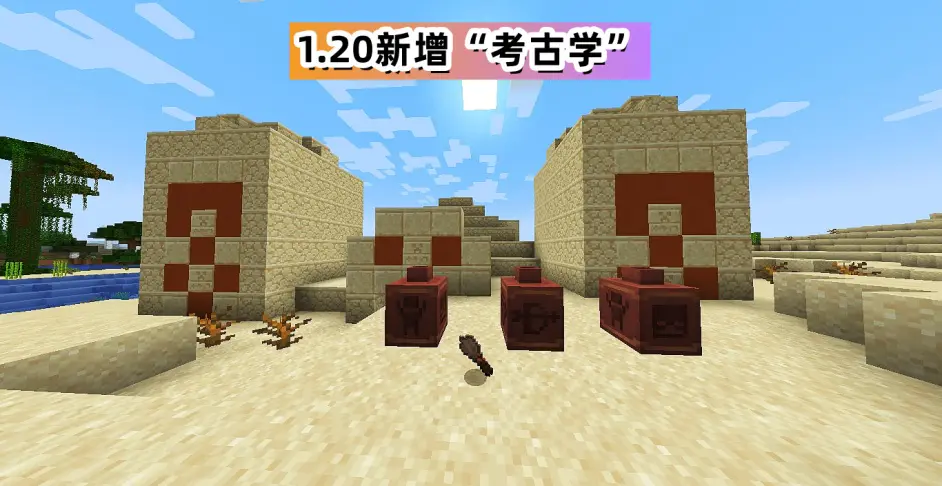 2、實驗性玩法新增了大量內容:刷子、陶片、紋飾陶罐、可疑的沙子等於JAVA版幾乎完全一致的考古系統。主要玩法就是以刷子在沙漠中的沙漠遺蹟和沙漠水井找到可疑的沙子進行考古,然後在可疑的沙子找到陶罐碎片,碎片合成陶罐,這就是目前考古系統的核心玩法。