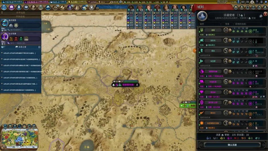 - 這個時候大陸單奢侈導致前期城市宜居度不足的問題開始顯現,不敢隨便賣奢侈了,把手裡的兩個使者送給博洛尼亞,阿瑪尼調到桑吉巴爾(需要5使者,阿瑪尼2 + 騎手任務1,還需要2使者,解鎖神學和文學傳統後成功宗主)。