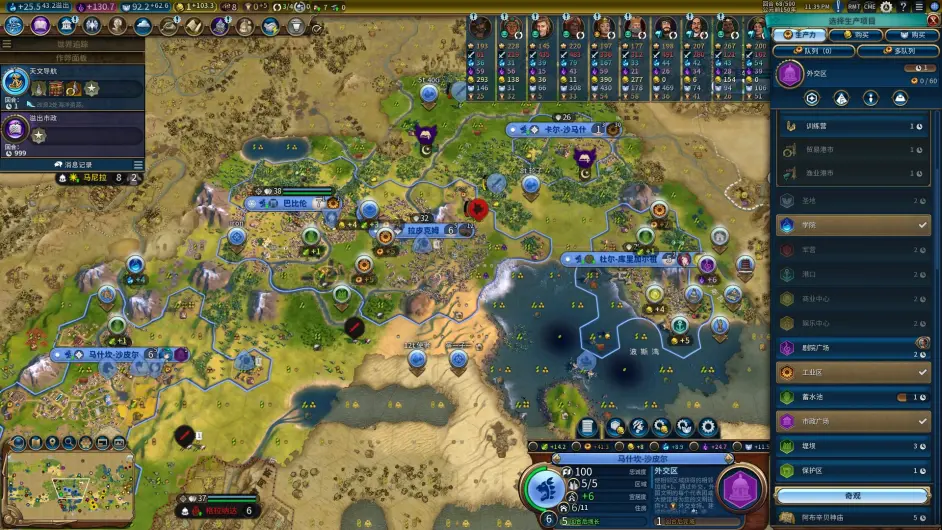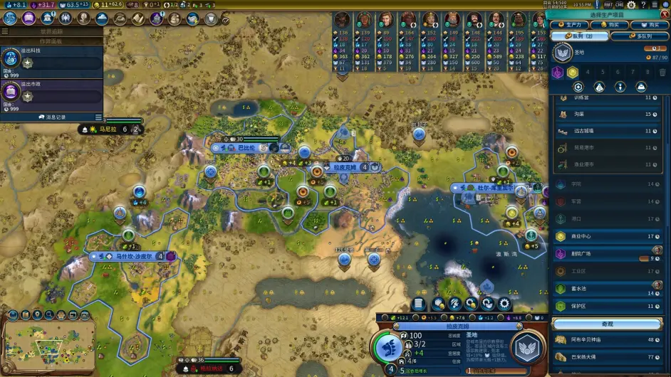 接下來看前三城的發展,首都和一分可以考慮聖地 + 商業,鐵城落工業和goven區,goven區錘謁見廳,用謁見廳的 + 1區域位可以落學院錘大圖,儘早把ylk的比例提升到99.9%;新城的工人可以靠鴿 + 金買出。另外一點,巴比倫的文明能力鼓勵早期錘不同型別的區域;前三城加上要趕快鋪下的海誠,很容易在早期湊出聖地 + 商業 + 學院 + 工業 + 港口 + 市政6類區域,各類區域的buff疊加到其他型別區域的產出也很可觀。