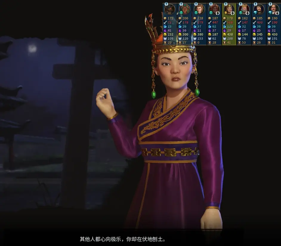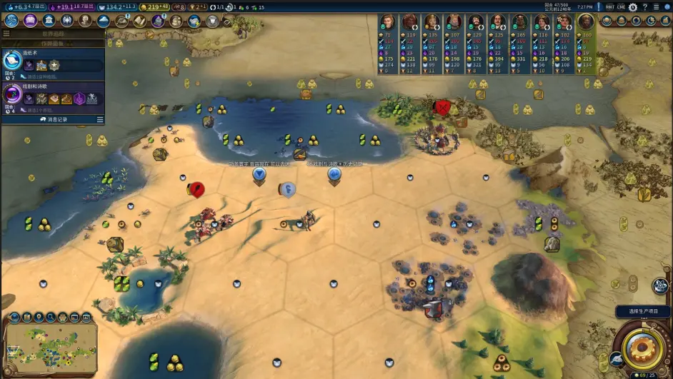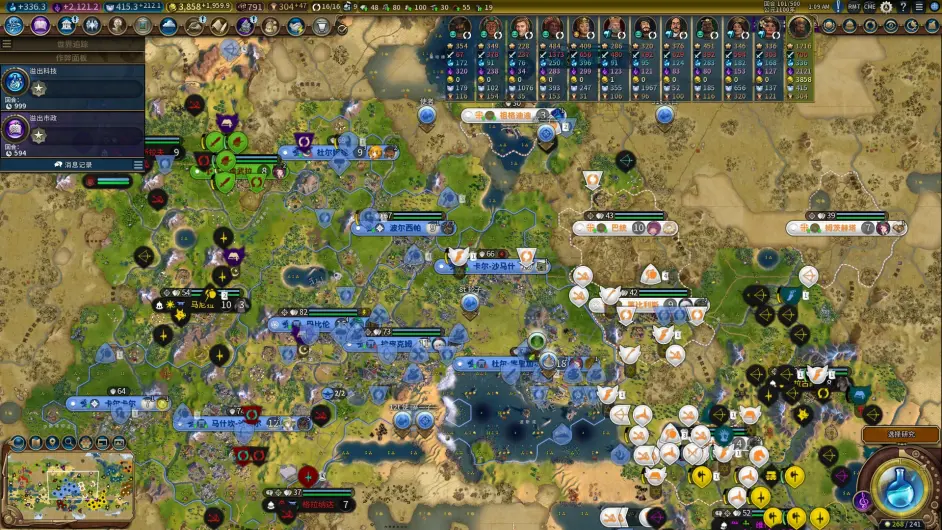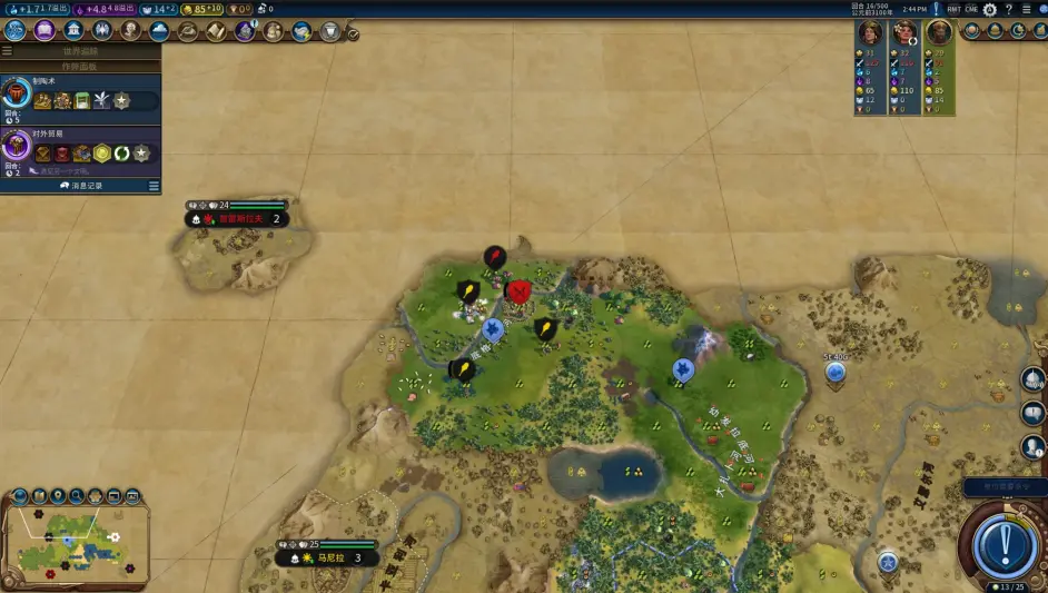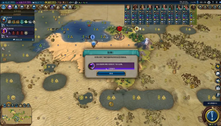 16t,首都坐上撿了個寨子(剛開始出的探路單位是UU,考慮到後面用UU清寨子還能發鑄銅ylk和軍事傳統鼓舞,因此掛的卡是紀律而不是調查),順便首發第二個軍邦;派到首都左下側的UU探到甘嘉快樂國(瓦茲強貝拉弗維可醬:?)和黑阿姨;這把經濟不錯,首發金邦 + 首發兩個奇觀 + 清理7環寨子爆了不少金幣,準備再攢一攢買工人錘移民,走雙城雙聖地發酵。